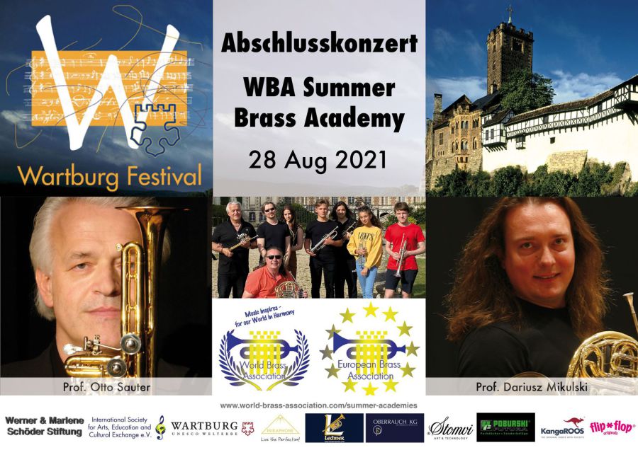 Otto Sauter und sein polnischer Kollege, der Hornist und Dirigent Dariusz Mikulski präsentieren mit dem World Brass Association Student Ensemble das Abschlusskonzert der WBA Brass Sommerakademie im Festsaal der Wartburg mit Werken für Blechbläserensemble wie: